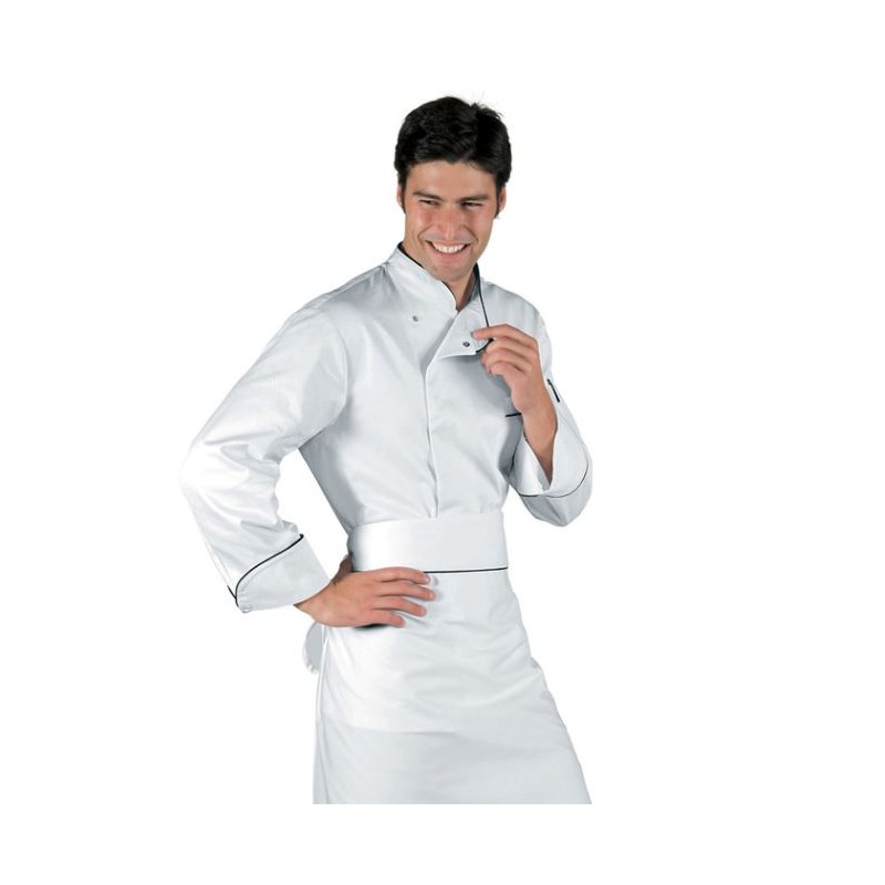 La giacca cuoco Bilbao bianco/nero Isacco è realizzata in 100% cotone 210 gr/mq. Una linea moderna con manica lunga e bottoni a pressione. Un modello con rete d'areazione ascellare per migliorare la traspirazione e il comfort durante il lavoro. Modello uomo. Colore bianco profilato nero. 100% cotone 210 gr/mq Manica Lunga,Bottoni a Pressione Taschino Manica Sinistra Taschino Lato Cuore