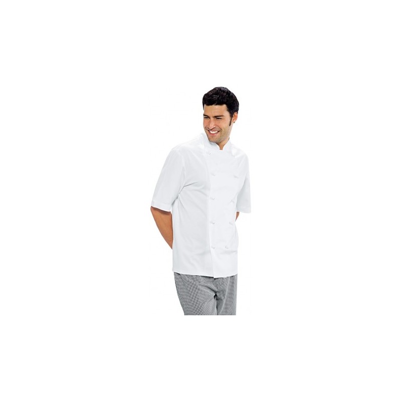 Giacca da cuoco a maniche corte, realizzato con il tessuto igienico per eccellenza, il cotone, al 100%. E' dotata di una doppia file di bottoni tondi di colore bianco, asportabili ed eventualmente sostituibili.