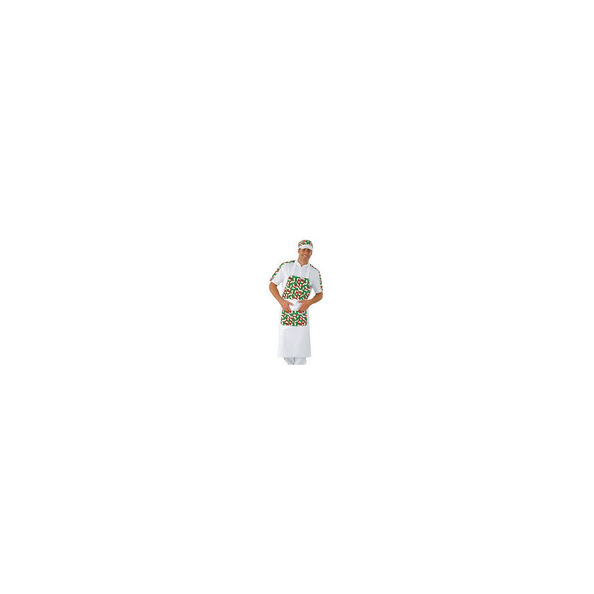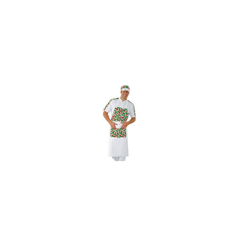 Grembiule professionale intero con pettorina, in cotone 100%, grammatura del tessuto 210 gr/m2. Taglia unica con altezza regolabile. Il grembiule è bianco, la tasca doppia e la pettorina sono decorate con fantasia di bandiere italiane.