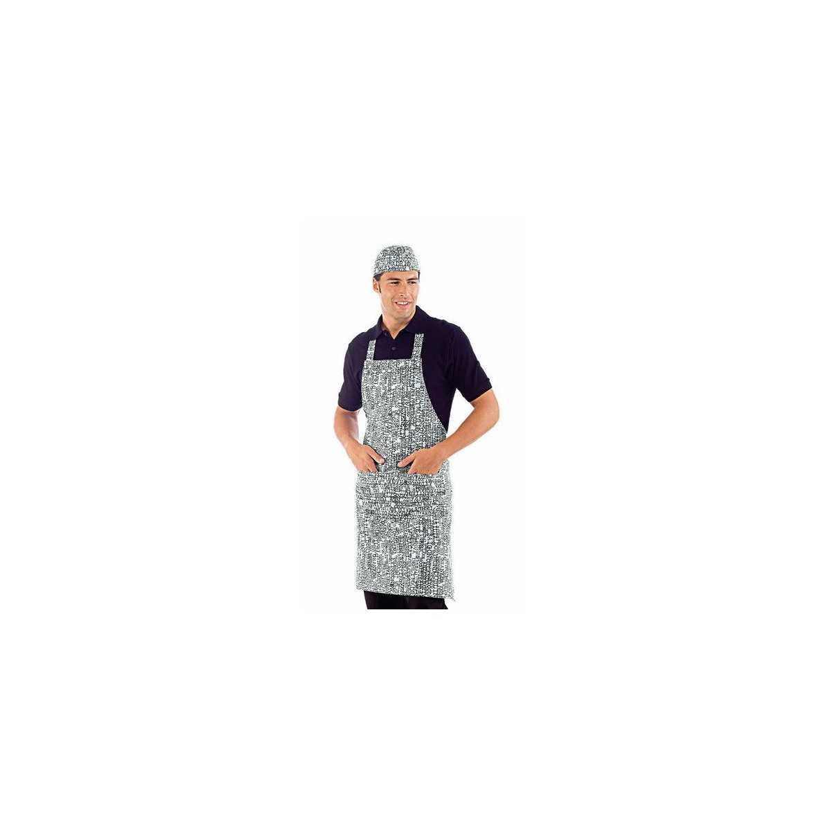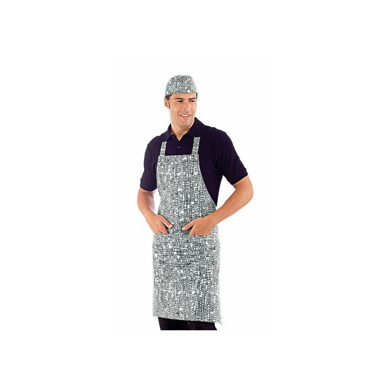 Grembiule stile pettorina grembiule professionale, realizzato in tessuto cotone al 100% Viene prodotto in un unica taglia, con misura di cm. 70x90. Lacci posteriori per il fissaggio in vita, ampia tasca nella zona anteriore.