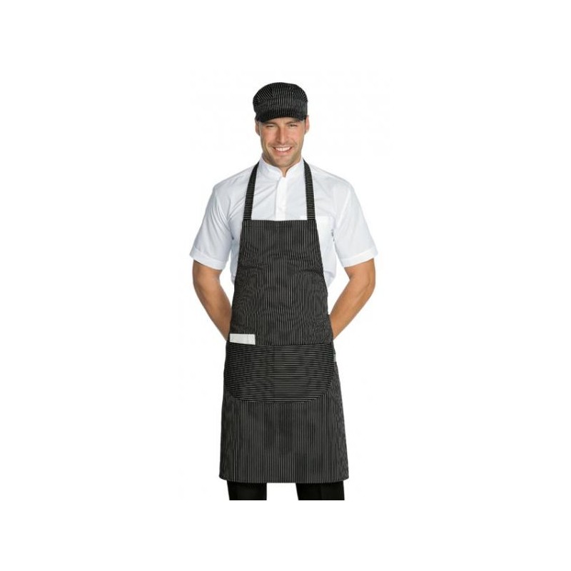 Grembiule con pettorina Vienna. In tessuto resistente e pratico da lavare, 65% poliestere e 35 % cotone, questo è un modello adatto ad abbinarsi a camicie di ogni colore.