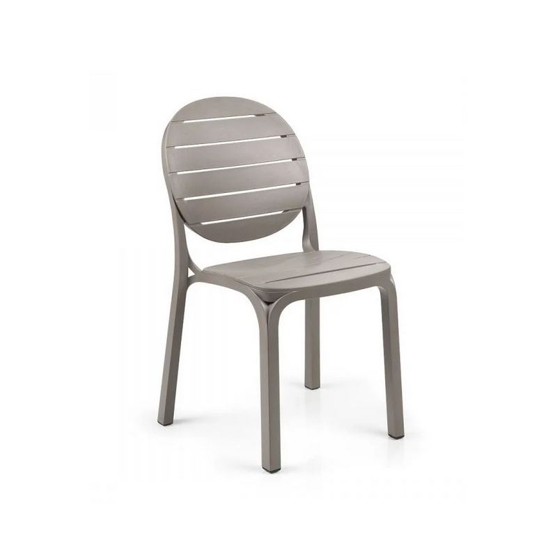 Sedia senza braccioli. Materiale: polipropilene trattato anti-UV e colorato in massa. Finitura opaca. Dotata di piedini antiscivolo. Resina riciclabile