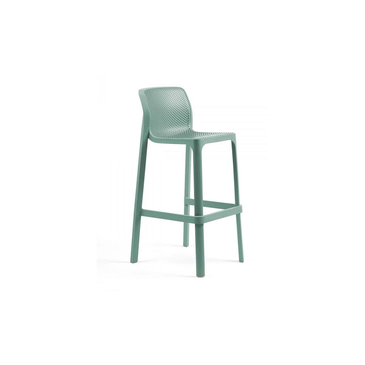 Sgabello monoblocco. Materiale: polipropilene fiberglass trattato anti-UV e colorato in massa. Finitura opaca. Dotato di piedini antiscivolo. Altezza seduta 76 cm. Resina riciclabile.