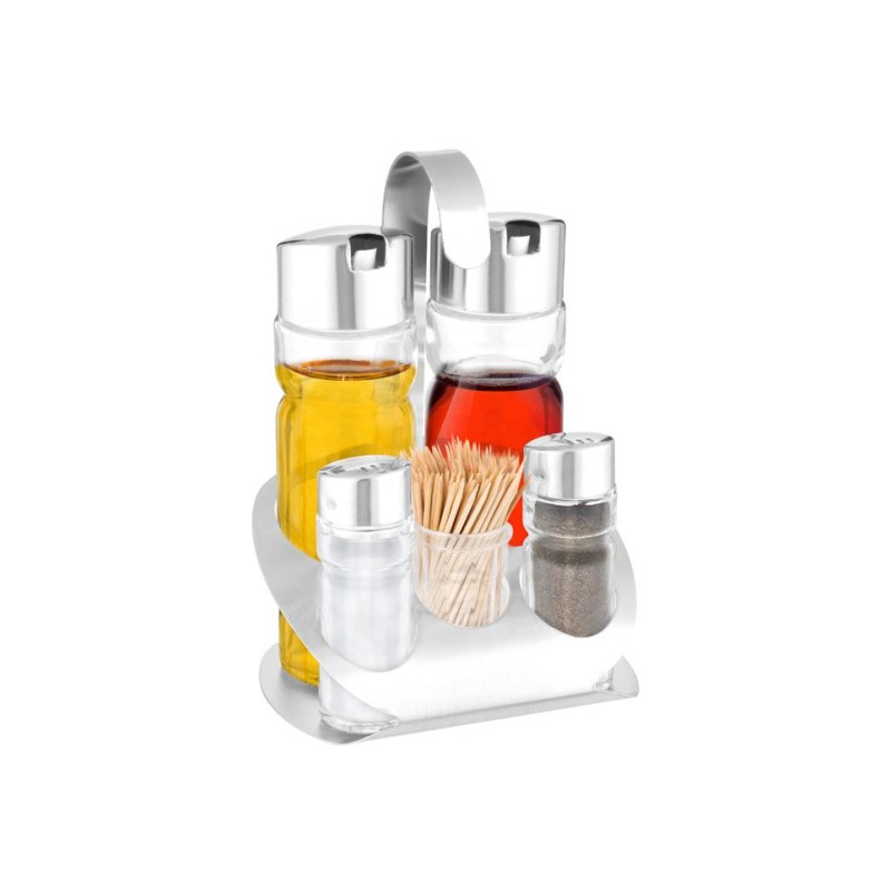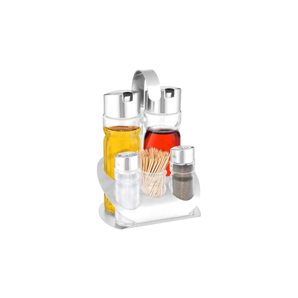 Menage 5 pezzi serie Amalfi in vetro e inox 18/8 2 ampolle per olio/aceto in vetro con coperchi in acciaio inox 18/8 2 ampolle per sale/pepe in vetro con coperchi in acciaio inox 18/8 1 porta-stuzzicadenti in vetro