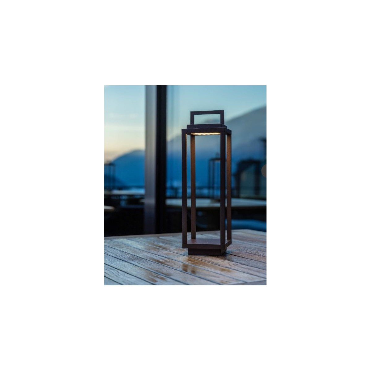 Lampada da tavolo ricaricabile Resort. Uso interno/esterno. La struttura della lampada è in alluminio verniciato grigio. La lampada è dotata di un interruttore touch che consente l'accensione, lo spegnimento e la regolazione della luminosità. Autonomia di circa 12 ore, tempo di ricarica da 6 a 8 ore. Base di ricarica e caricatore inclusi.