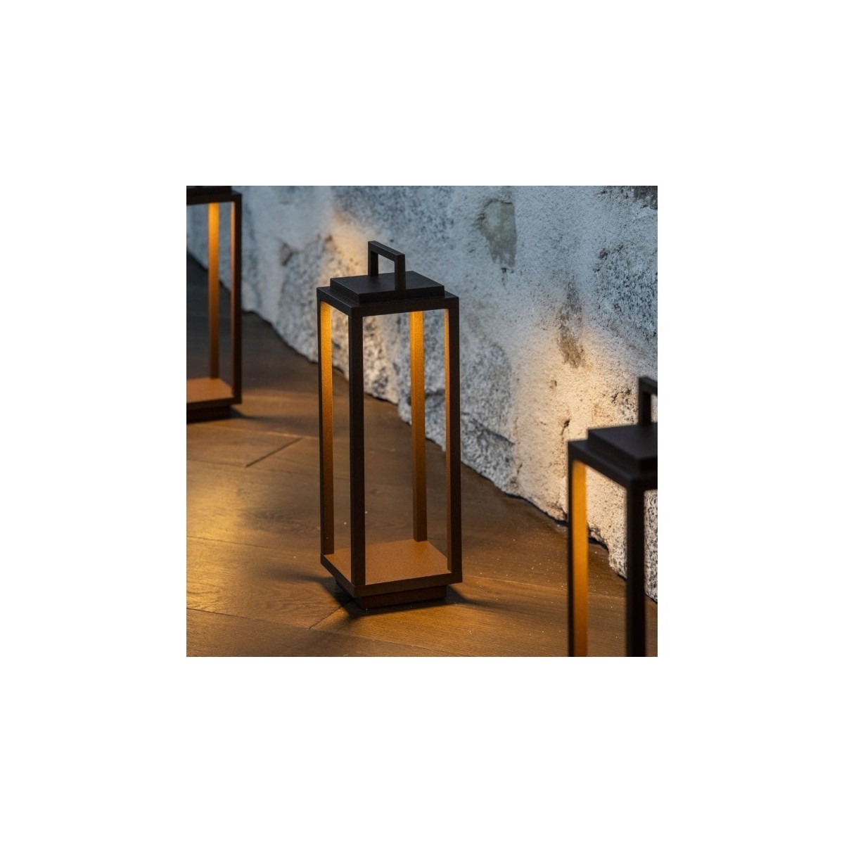 Lampada da tavolo ricaricabile Resort. Uso interno/esterno. La struttura della lampada è in alluminio verniciato grigio. La lampada è dotata di un interruttore touch che consente l'accensione, lo spegnimento e la regolazione della luminosità. Autonomia di circa 12 ore, tempo di ricarica da 6 a 8 ore. Base di ricarica e caricatore inclusi.