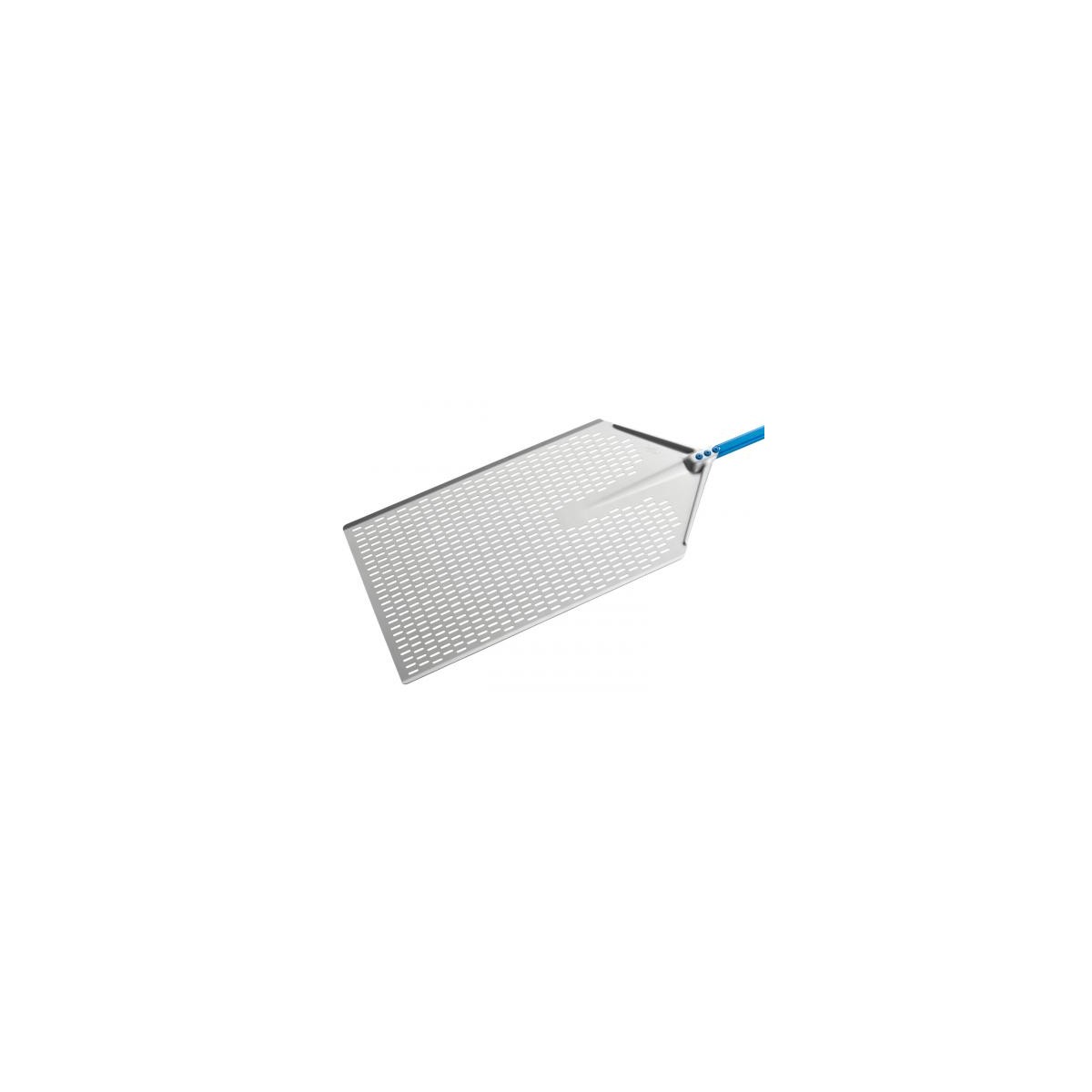 Pala in alluminio anodizzato per pizza a metro, una tipologia particolare di pizza di formato maxi. La pizza può essere impalata direttamente con lo strumento oppure stesura della pasta e farcitura possono essere eseguite direttamente sulla pala.