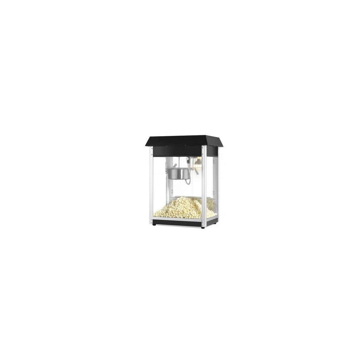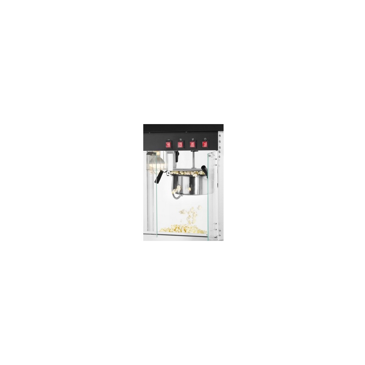 Telaio realizzato in lega di alluminio. Robusto alloggiamento realizzato in vetro temperato e acciaio verniciato a polvere in due colori disponibili: rosso o nero. Con porta di servizio incernierata in vetro temperato. Padella di cottura con unità di agitazione. Coperchio con maniglie in materiale non riscaldante. Linguetta di raccolta popcorn. Cassetto smerigliato sotto la camera per un facile smaltimento di chicchi e briciole non scoppiati. I chicchi e le briciole non scoppiati vengono raccolti sotto il cassetto delle briciole.