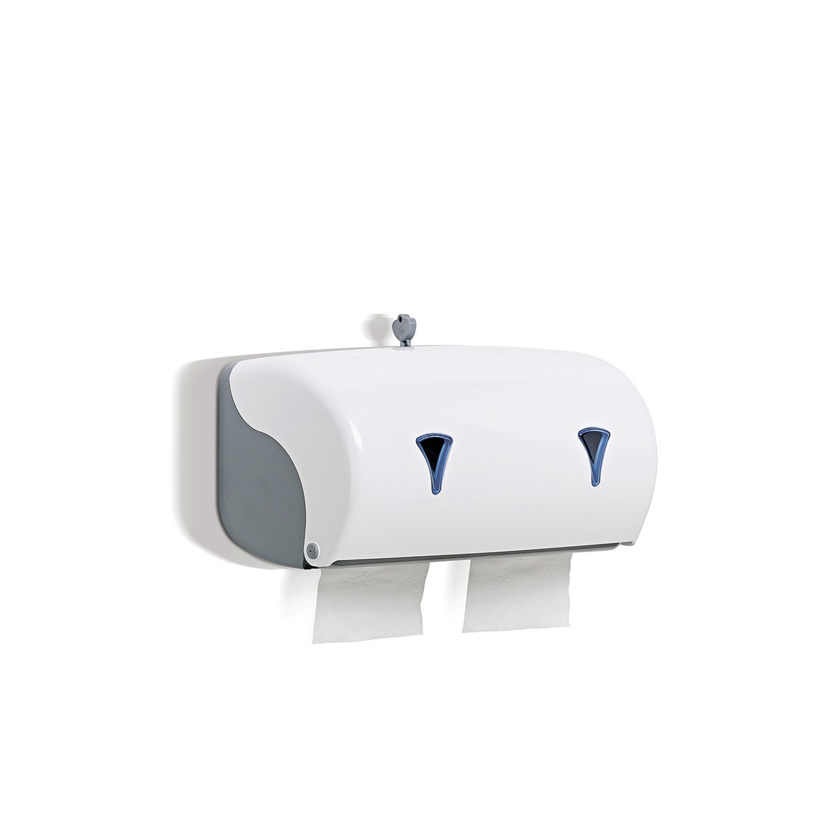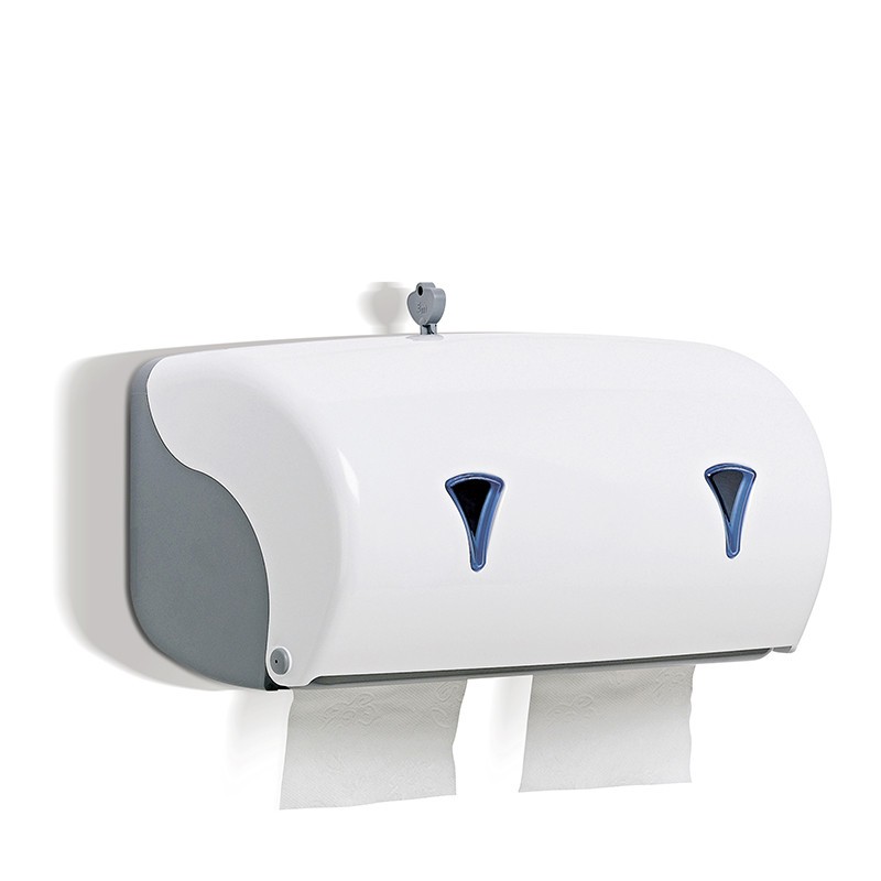 Portarotoli doppio da muro, in ABS, per carta igienica, con chiave di sicurezza e finestrella di fine rotolo.