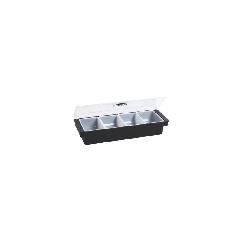 Realizzato in ABS resistente, questo portacondimenti a 4 scomparti è perfetto per bar e locali che vogliono preparare cocktail e drink con guarnizioni curate e professionali.