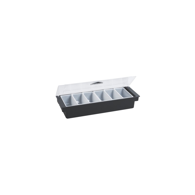 Realizzato in ABS resistente, questo portacondimenti a 4 scomparti è perfetto per bar e locali che vogliono preparare cocktail e drink con guarnizioni curate e professionali.