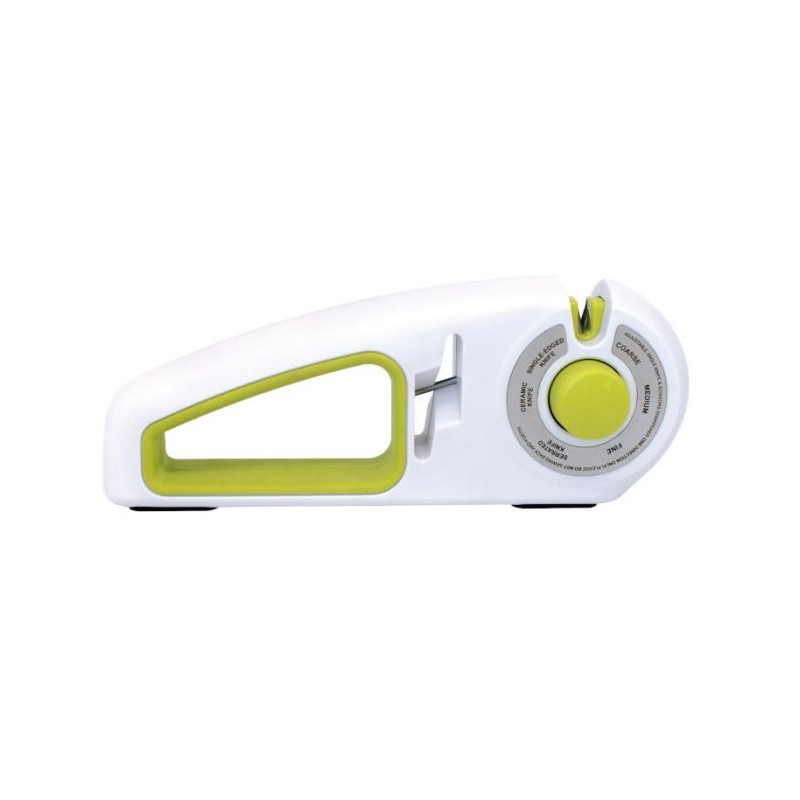 Affilacoltelli manuale con 7 meccanismi di affilatura, dotato di impugnatura ergonomica soft touch in TPE e corpo in ABS. Meccanismo di affilatura in acciaio diamantato per sgrossare la lama e riparare e riparare i bordi danneggiati.
