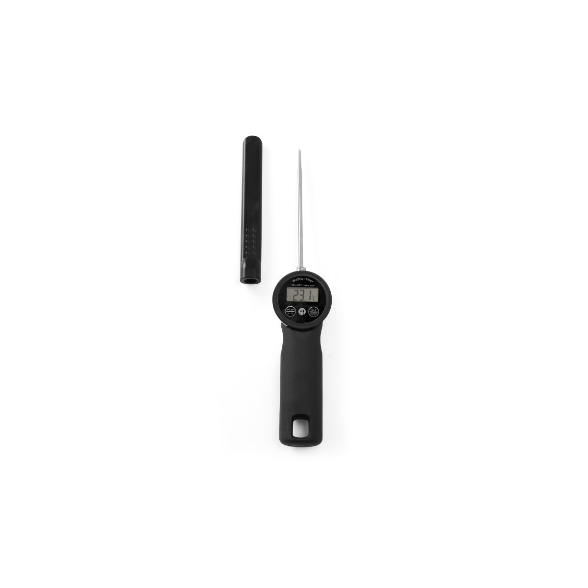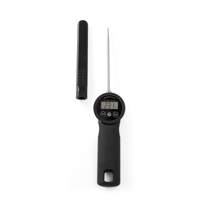 Resistente all`acqua. Misurazione da -50°C a +300 °C Risoluzione 0,1°C tra - 19,9 e 199,9 °C, per altre temperature 1°C. Precisione 1°C tra - 20 e + 100 °C, per altre temperature ± 2°C. Funzione di mantenimento momentaneo della misurazione. Sonda in acciaio da 120 mm. Misura la temperatura in un secondo. Custodia con manico ergonomico. Si spegne automaticamente dopo 10 min. Batteria inclusa.