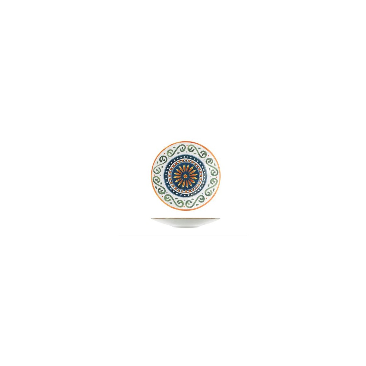 La forma ampia e lineare valorizza ogni pietanza, mentre la finitura liscia è caratterizzata da un pregevole decoro che unisce armoniosamente elementi classici e moderni. Il colore viene applicato con una tecnica affossante, che crea un piacevole gioco di rilievi sulla superficie decorata, donando profondità e texture al design. Questa lavorazione artigianale rende ogni pezzo unico, aggiungendo eleganza e personalità alla tavola.