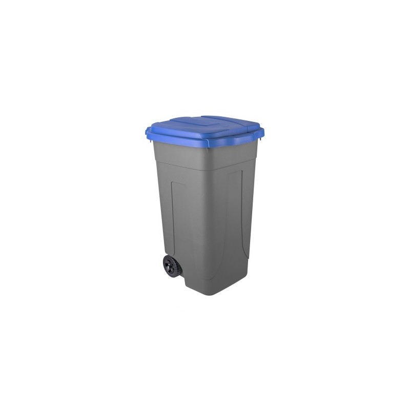 Pratico bidone porta rifiuti con ruote, realizzato in PP (Polipropilene) 100% riciclabile, disponibile in versione bicolore con fondo grigio e coperchio colorato (blu, giallo, rosso e verde). Il bidone è particolarmente adatto per ambienti interni.