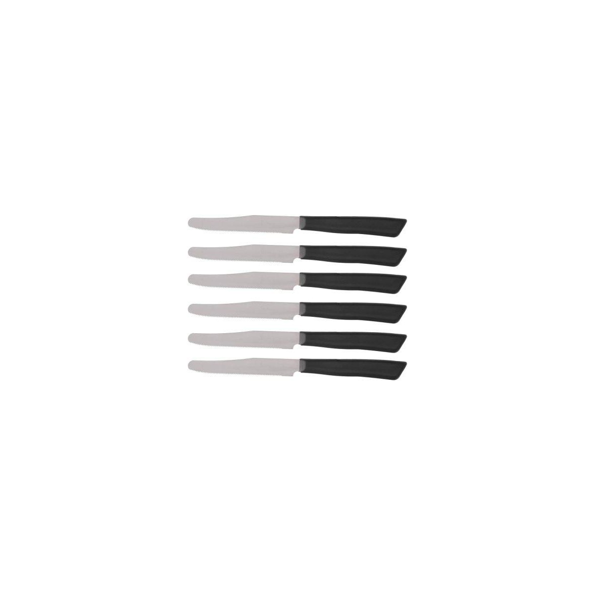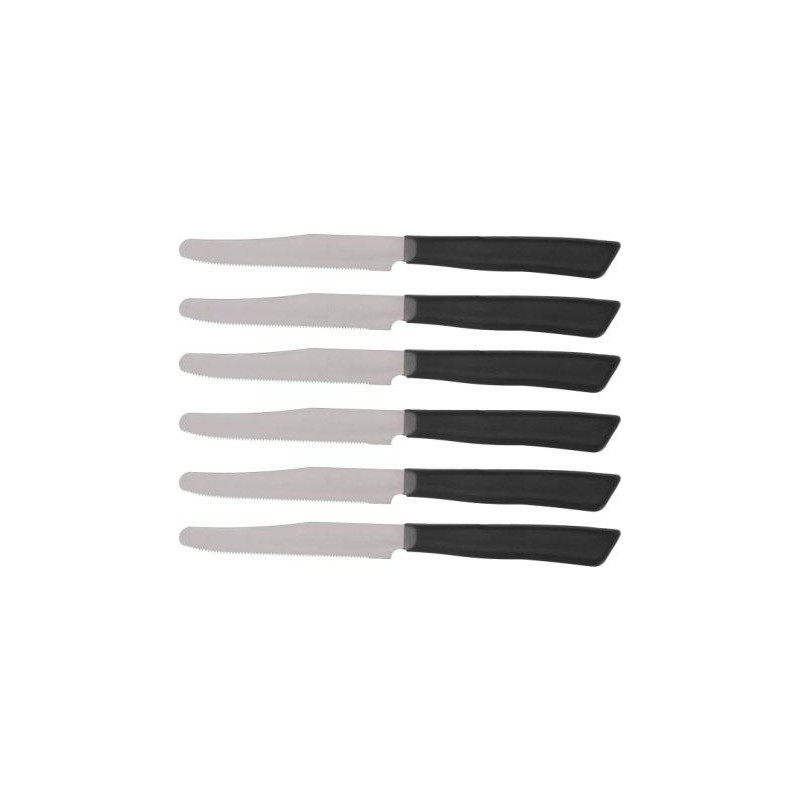 Blister contenente 6 coltelli da tavola con manico nero, progettati per un utilizzo quotidiano sia in ambito domestico che professionale. I coltelli presentano una lama affilata in acciaio inox resistente alla corrosione, ideale per tagliare facilmente carne, verdure e altri alimenti. Il manico ergonomico di colore nero offre una presa salda e confortevole, garantendo sicurezza e comodità durante l’uso.