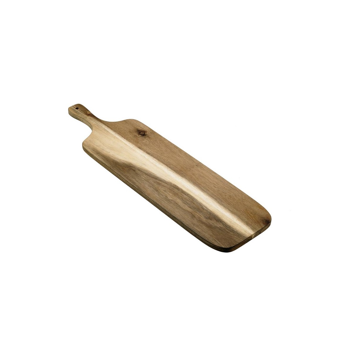 Elegante e naturale, questo tagliere in legno di acacia è un complemento ideale per la cucina e la presentazione in tavola. Con le sue generose dimensioni di 75 x 20 cm e uno spessore di 1,6 cm, è perfetto per servire antipasti, formaggi, salumi, pane o sushi in modo scenografico e raffinato.