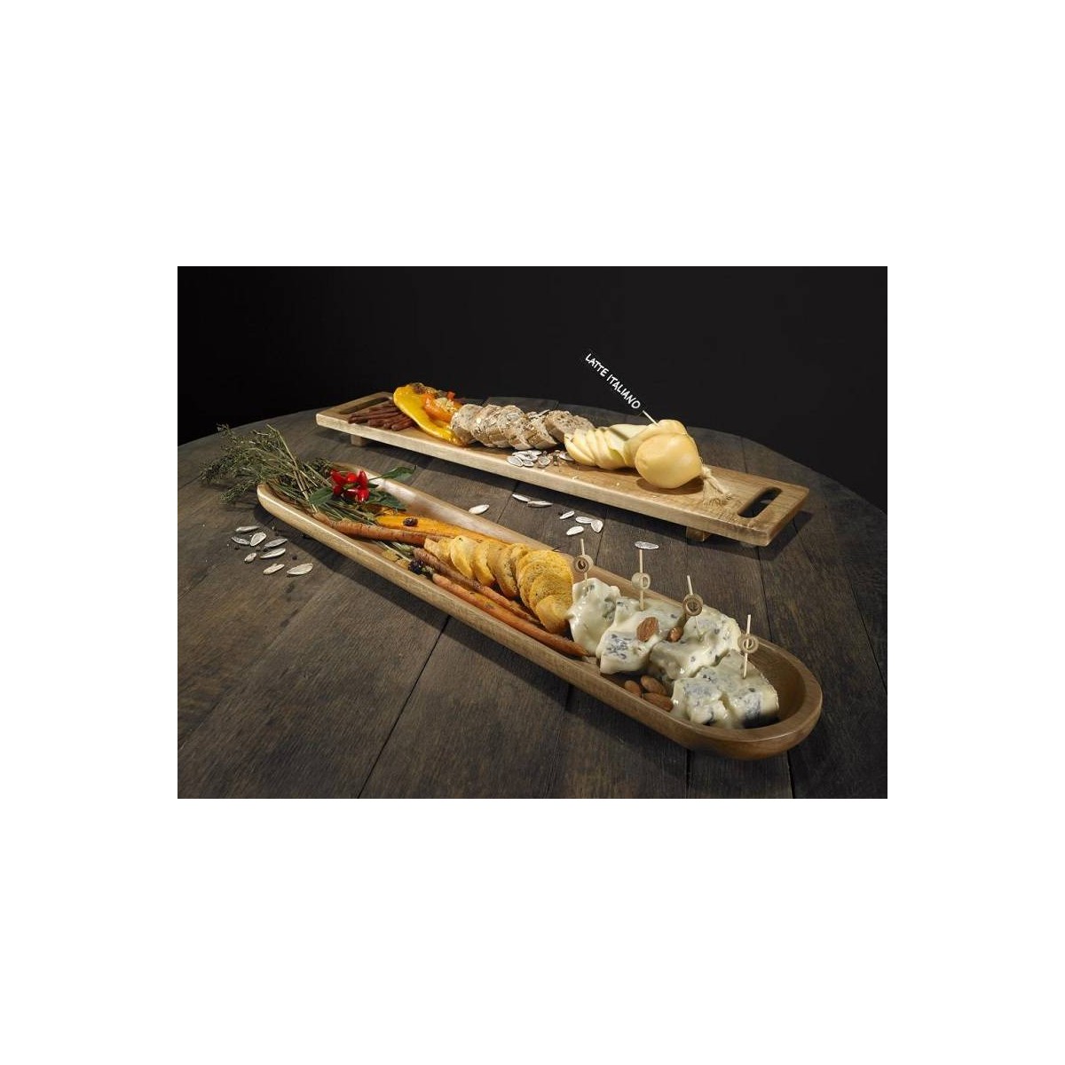 La superficie liscia e la tonalità calda del legno di acacia donano al vassoio un aspetto naturale e raffinato, perfetto per valorizzare ogni presentazione, sia in contesti moderni che più tradizionali. La sua forma allungata e la robustezza del materiale lo rendono ideale per servire antipasti, snack, finger food o per accompagnare bevande e snack durante momenti conviviali.